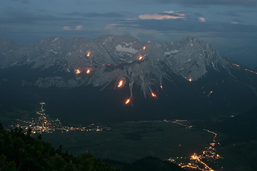 SOLSTICE CELEBRATIONS: No, this mountain in the Austrian Alps is not spewing lava. It's a summer solstice celebration.